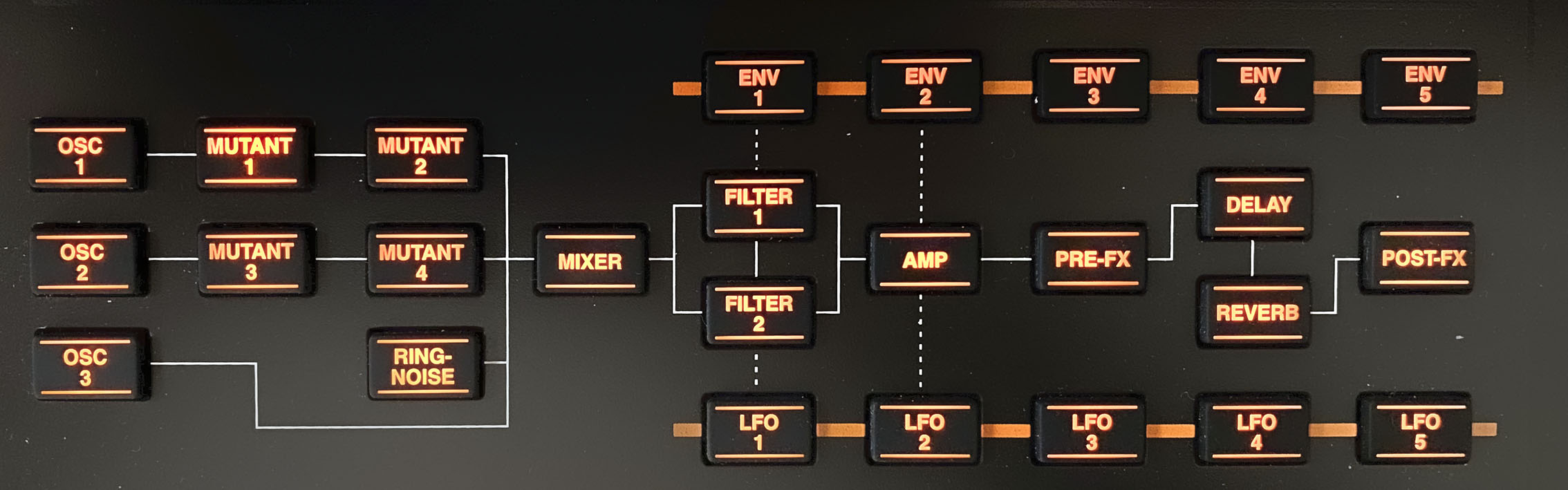 Anche se l’Hydrasynth può essere usato come un normale synth VA, in sintesi sottrattiva, e devo anche ammettere con risultati sorprendenti, la sua caratteristica principale sono le wavetables e quelli che vengono chiamati MUTANT, cioè moduli che alterano le forme d’onda in entrata. Se osserviamo il pannello di editing, partendo da sinistra, vedremo tutti i moduli che costruiscono il percorso del segnale del synth. Ci sono: