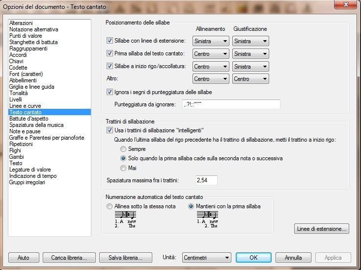 E per i più esperti? Ecco le “opzioni del testo cantato”. In questa finestra, molto articolata e per alcuni aspetti un po’ complessa, è possibile stabilire tutti i parametri del nostro testo. Come sempre Finale, grazie anche alla sua complessità, ci permette di modificare ogni cosa e non lasciare impostazioni di default. In questa finestra possiamo personalizzare davvero tutto.. Il posizionamento delle sillabe e il loro allineamento, la loro giustificazione, quando e come usare i trattini di sillabazione e, cliccando sul pulsante “linee di estensione”, addirittura decidere come intervenire su queste linee (quando usarle, quanto lunghe ecc..) (Fig.6).
