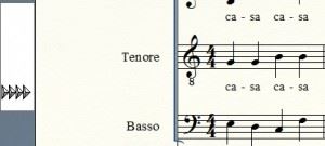 Abbiamo accennato prima a quattro piccoli triangoli sul foglio, ricordate? Meritano la nostra attenzione ed un nostro approfondimento (Fig.4). Questi piccoli triangoli permettono la formattazione del testo, il suo spostamento in alto o in basso sotto i pentagrammi.
