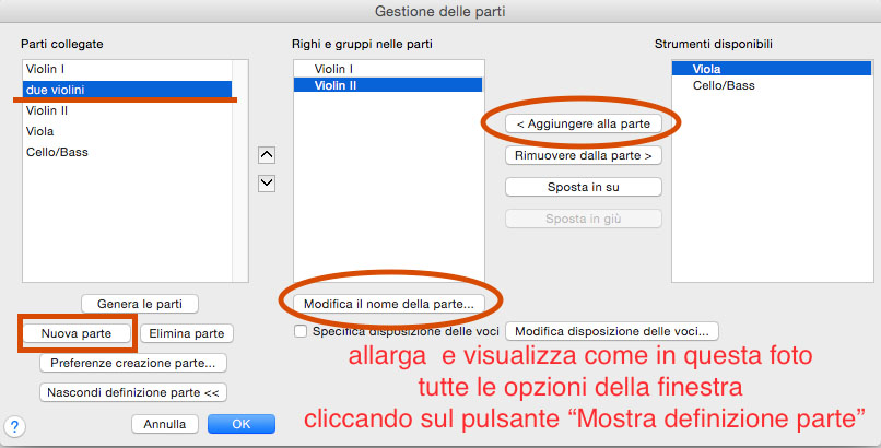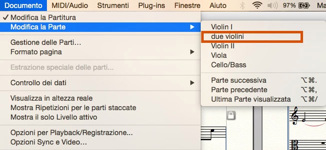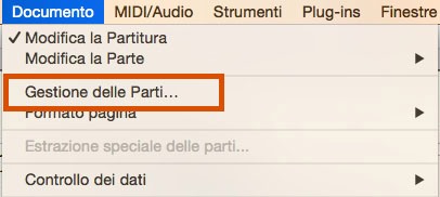 Spesso in orchestra è necessario avere un’estrazione parti a 2 o più strumenti: ottoni, archi e talvolta legni necessitano di questa opzione per avere nello stesso foglio non il singolo strumento ma la coppia o più. Per fare questo dovete creare una parte personalizzata. Cliccando sul menu Documento accederete alla voce Gestione delle parti (Fig.8).