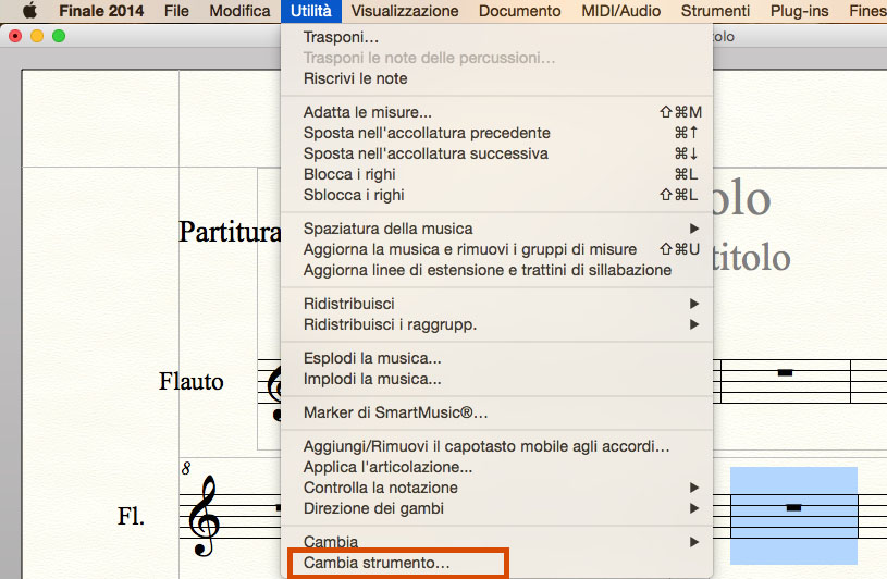 Questa funzione è tanto utile quanto di facile applicazione. Selezionate la battuta dove volete ottenere il cambio di strumento. Cliccate sul menu Utilità e quindi scegliete l’ultima voce del menu denominata appunto Cambio di strumento (Fig.6).