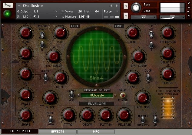 Sempre più produttori, sopratutto indipendenti, stanno puntando alla creazione di librerie per Kontakt che poi si rivelano dei veri e propri strumenti a se stanti. Tutto questo grazie alle capacità di Kontakt, con la possibilità di programmarne il comportamento tramite linguaggio di programmazione interno e la possibilità di creare ed utilizzare interfacce grafiche accattivanti e complete. Oscillosine è uno strumento che sfrutta il vintage in modo nuovo ed interessante accontentando così chi è sempre alla ricerca di sonorità analogiche, calde, ma con una vita nuova. Intendiamoci, basterebbe un sintetizzatore, più o meno modulare, che produca delle sinusoidi, qualche controllo, e sarebbe possibile ricreare le stesse sonorità di Oscillosine. Quello che colpisce è sicuramente l’originalità con cui vengono sfruttati dei campioni ricavati da apparecchiature vintage emulando, su un campionatore, un sistema di sintesi semplice ma efficace. Sembra davvero di smanettare su un vecchio sintetizzatore trovato in garage. A tale proposito alla fine della descizione del produttore, è riportata questa simpatica frase: