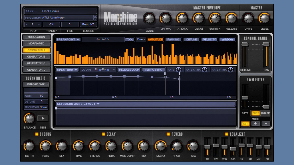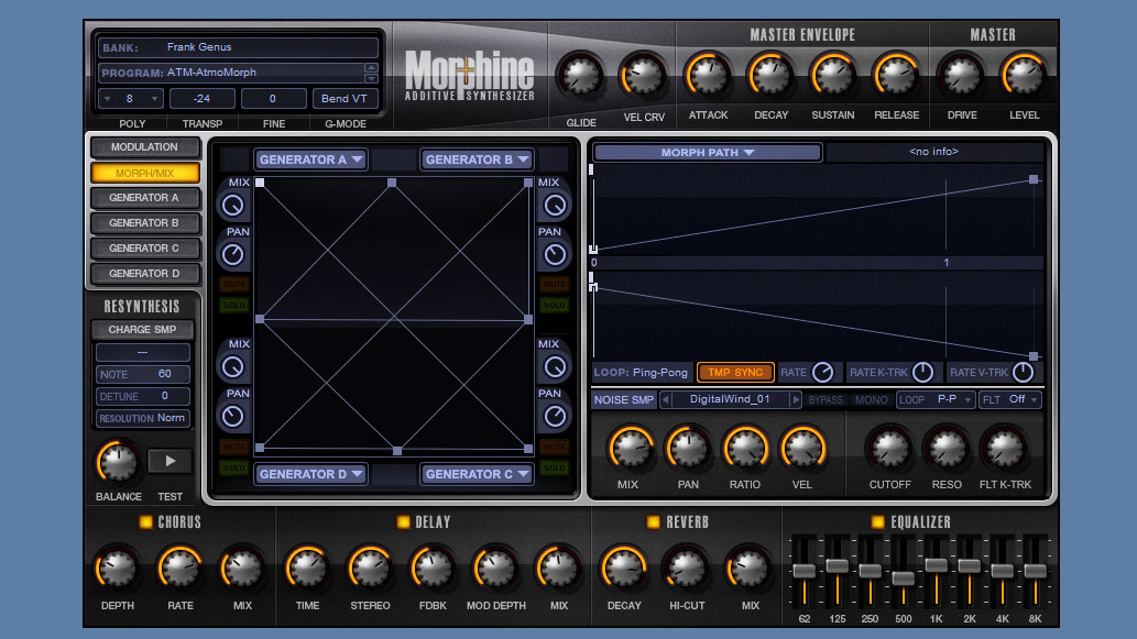 Morphine è anche dotato di una piccola sezione effetti comprendente un Chorus, un Delay, un Riverbero ed un Equalizzatore ad 8 bande nonché di un Distorsore posto di fianco al Master Level. Nulla di eccessivamente spettacolare, ma fanno egregiamente il loro lavoro senza gravare sulla CPU. Peccato che il riverbero, a mio parere, possa risultare un pò troppo metallico anche se in determinati contesti questa si rivelerà più una peculiarità che una lacuna. Peccato, inoltre, che non vi siano parametri per la distorsione o la possibilità di scegliere almeno un paio di algoritmi diversi. Questi piccoli accorgimenti renderebbero Morphine ancora più appetibile.