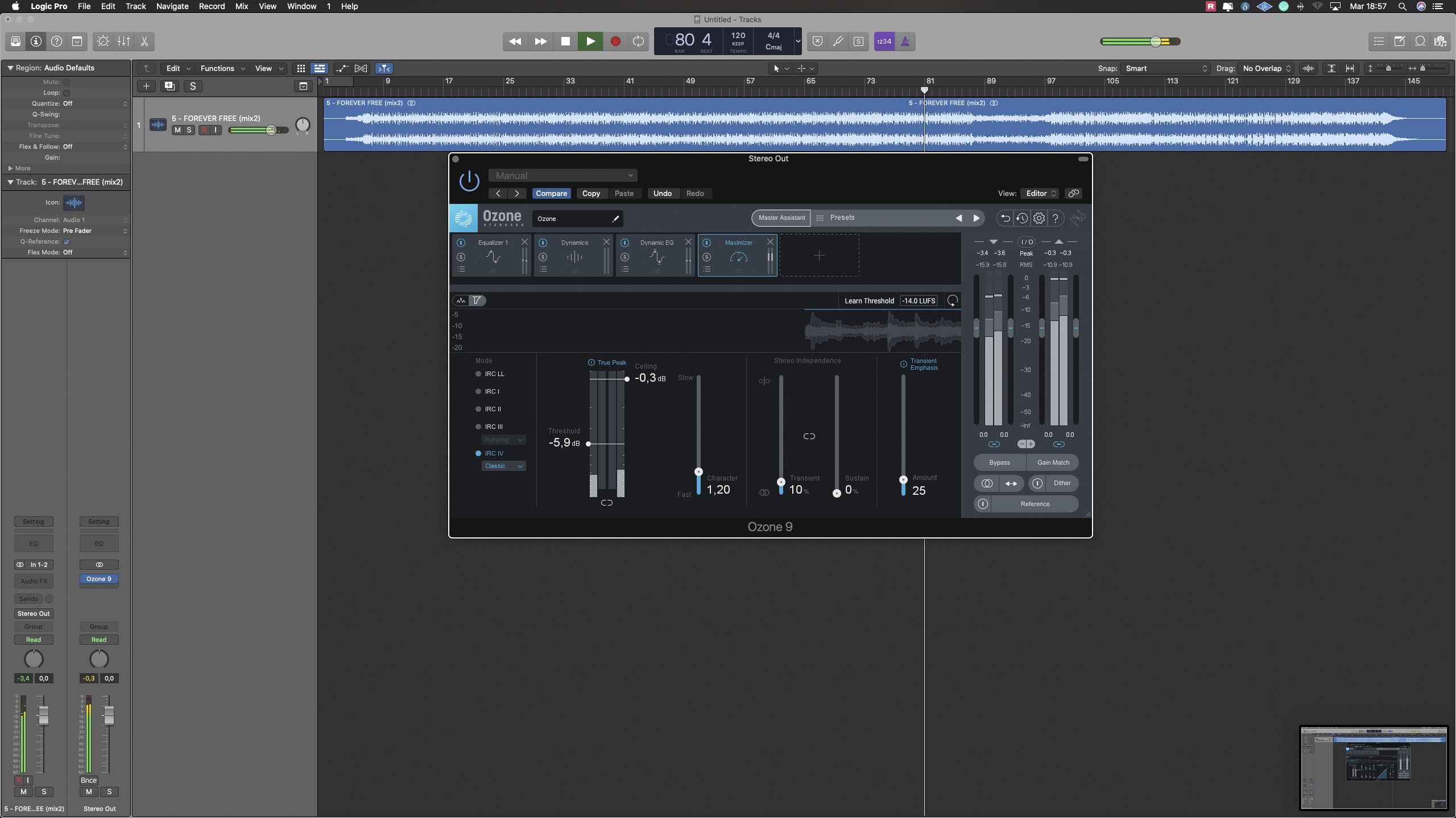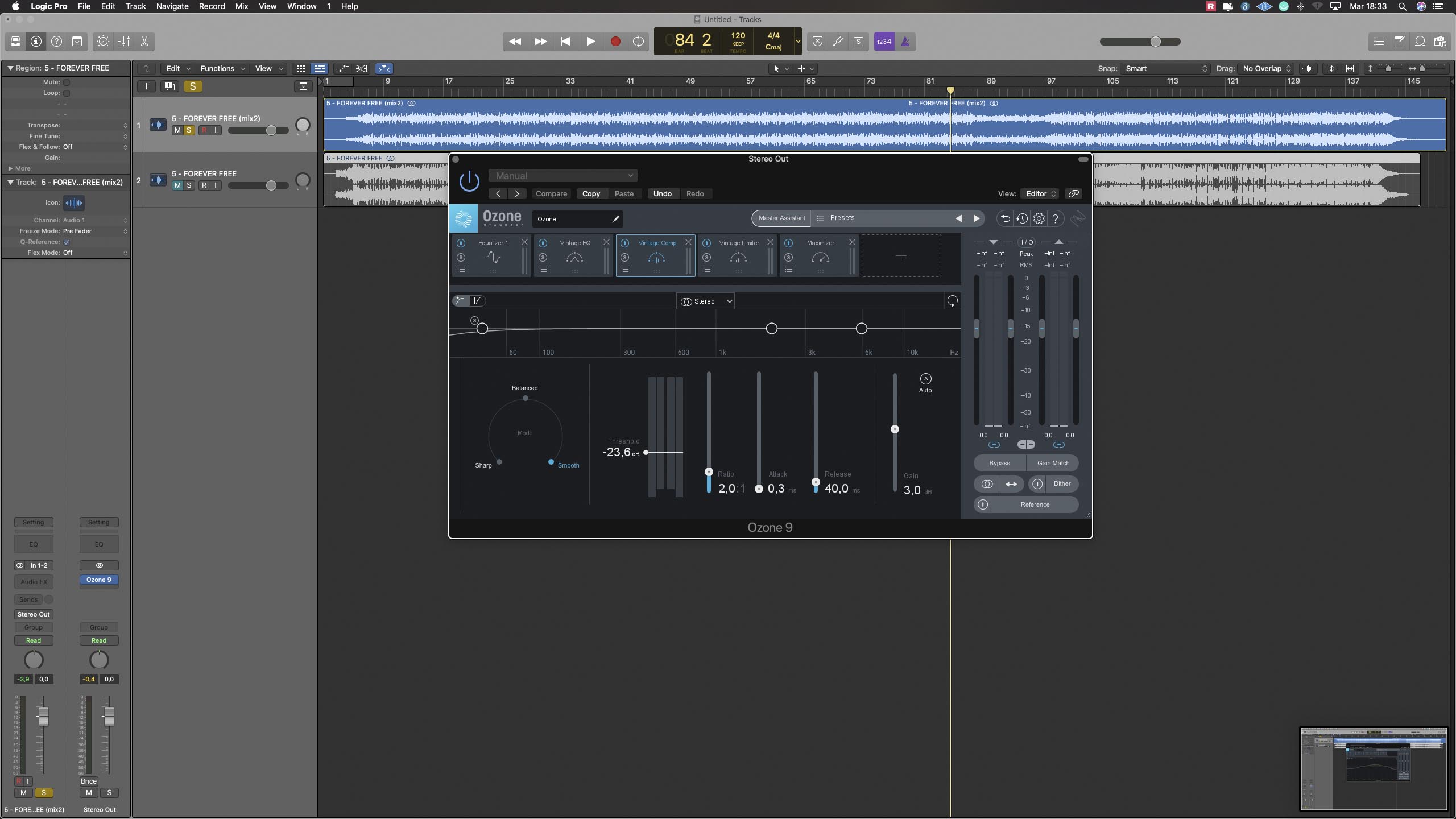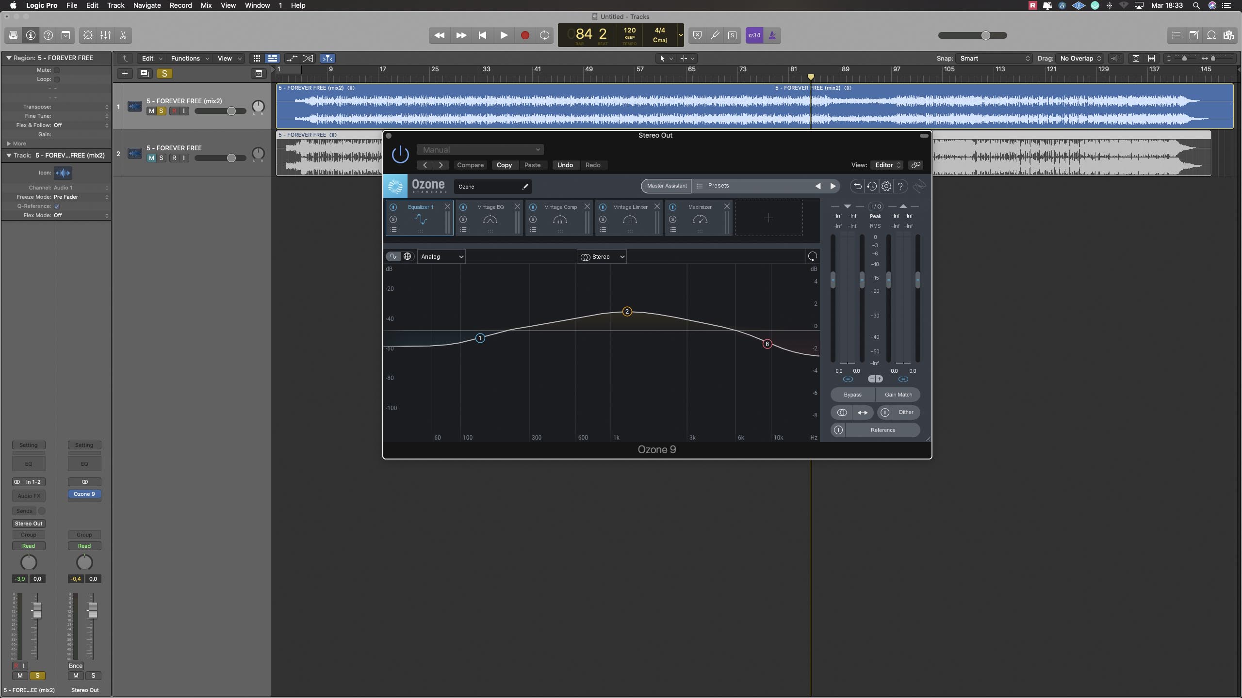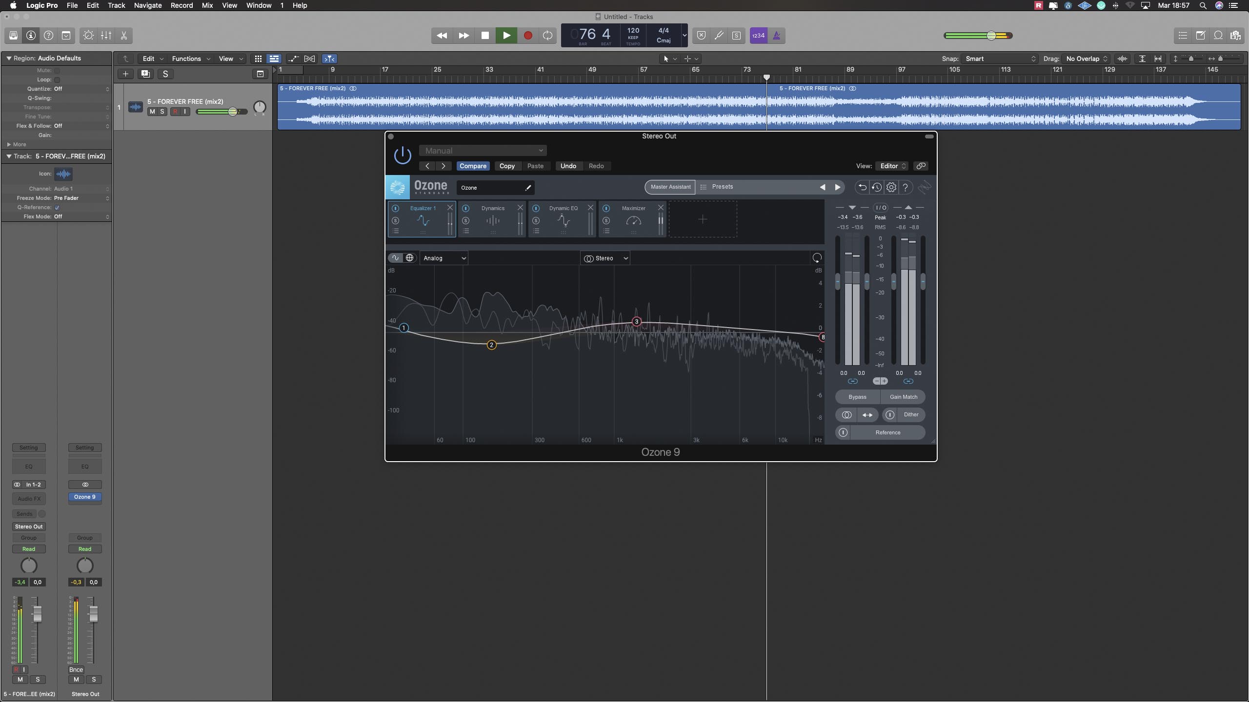 In questa nuova versione, oltre ai plugin già presenti nella versione 8, abbiamo una versione completamente nuova del Match EQ, presente già da tempo in altre suite, ma che fa il suo ingresso in Ozone. Il principio è abbastanza semplice, tramite i due slot REFERENCE e APPLY TO abbiamo la possibilità di catturare sia l’audio di riferimento che quello su cui stiamo andando ad applicare l’equalizzazione che ne verrà tratta. Tramite i parametri Smoothing e Amount andremo a decidere come e quanto applicare l’eq risultante. Il processo è tranquillamente scalabile anche per un preciso range di frequenza tramite due tendine presenti a sinistra e destra dell’interfaccia, oltre a poter essere gestito sia in Stereo, che in Mid\Side. Ritornando quindi alla funzione di Master Assistant, che è quella su cui andremo a fare degli esempi audio, prendiamo come base di partenza un brano, in questo caso Forever Free di Andrea Barone. Utilizzando la versione vintage del Master Assistant e l’equalizzazione manuale, dunque tramite analisi della traccia, viene fuori una precisa catena di mastering con anche varie impostazioni, alcune più discutibili di altre come potete vedere dagli screenshots (Fig. 1, Fig. 2, Fig. 3).