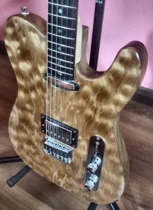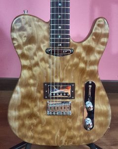 Legno totalmente a vista, nessun battipenna e solo il vano elettronico classico della Telecaster, paletta reverse e il top che si trasforma in un vero biglietto da visita.