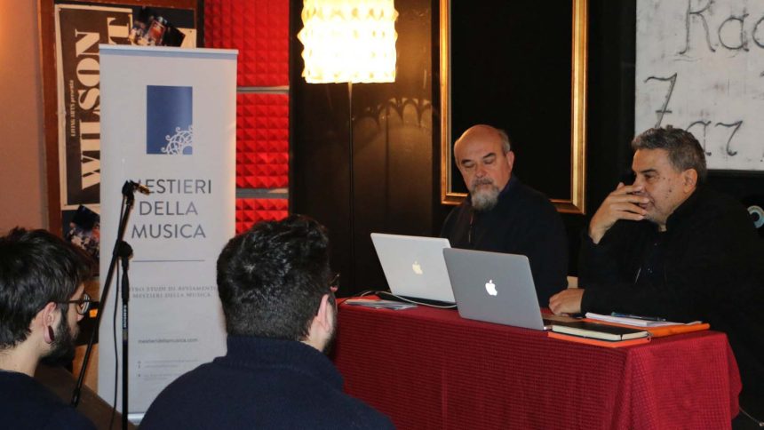 Se il buon Lecci, fonico tra i più apprezzati in Italia, ha dispensato esempi e consigli di natura tecnico-audio, il poliedrico Calabrese, autore di alcuni degli artisti sopra indicati, ha tenuto banco su alcuni esempi audio che hanno fatto nascere e consolidarsi diversi successi italiani. Personalmente ho avuto modo di apprezzare la narrazione del workflow discografico di “Credimi ancora”, laddove Calabresi ha dimostrato con diversi ascolti, come da un incipit musicale ed una sola parola, “ancora”, si sia potuto arrivare alla canzone completa, poi presentata così come la conosciamo ancora oggi da M. Mengoni.