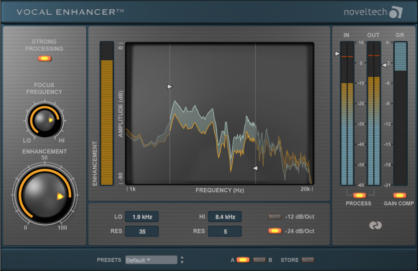 Noveltech Vocal Enhancer è un processore di voci basato su una tecnologia finlandese sviluppata dalla Noveltech Audio, e in particolare dal Dr Ismo Kauppinen. La IAF (Intelligent Adaptive Filtering), tecnologia su cui si basa il Noveltech , non si comporta come un equalizzatore classico, non amplia staticamente le frequenze, ne aggiunge armoniche al segnale audio; bensì aumenta dinamicamente le “caratteristiche scelte dall’utente”. La IAF utilizza un algoritmo dinamico, che si evolve in continuazione, adattandosi ripetutamente al materiale originale. Pur processando in maniera estrema il segnale audio originale, il risultato sarà sempre contraddistinto da sonorità naturali. Noveltech Vocal Enhancer consente di processare le voci e molto altro ancora, conferendo al suono una nitidezza e una freschezza invidiabili.