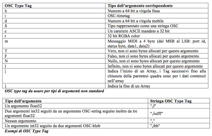 deve codificarlo con gli OSC type tag della seguente tabella: