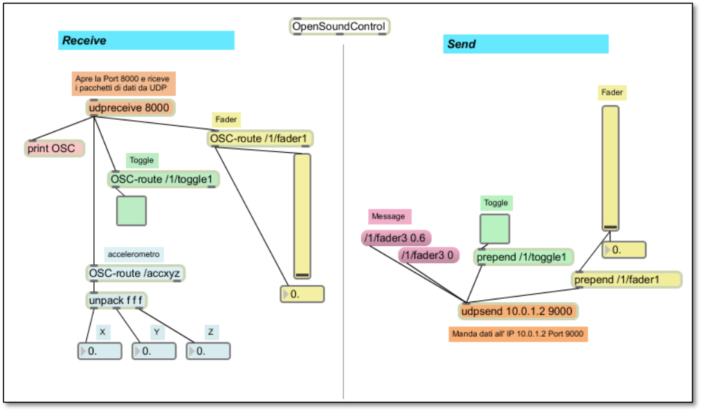 OSC all’indirizzo e numero di porta interessati (sendOSC) oppure ricevere da una