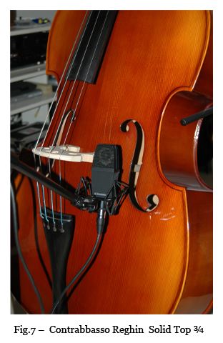 La chitarra classica utilizzata è una Admira modello Janita rigorosamente costruita in Spagna; il microfono è stato posizionato a circa 20 cm dallo strumento verso l’attaccatura del manico. 01 Ktr 5015 Pre: Microfono Samson C03 regolato per ripresa omnidirezionale e senza filtro low cut. Il segnale così ottenuto passa solo nel Pre-Amplificatore. 02 Ktr 5015 Pre “Silk”:  Microfono Samson C03 regolato per ripresa omnidirezionale e senza filtro low cut. Il segnale così ottenuto passa nel Pre-Amplificatore con il tasto “Silk” inserito. 03 Ktr 5015 Pre Comp: Microfono Samson C03 regolato per ripresa omnidirezionale e senza filtro low cut. Il segnale così ottenuto passa nel Pre-Amplificatore e nel compressore. La compressione utilizzata ha i seguenti parametri: Treshold -8; ratio 2:1; Attack 55ms; rilascio 500ms; Gain +1. 04 Ktr 5015 pre silk comp: Microfono Samson C03 regolato per ripresa omnidirezionale e senza filtro low cut. Il segnale così ottenuto passa nel Pre-Amplificatore con tasto Silk inserito e da qui nel compressore. La compressione utilizzata ha i seguenti parametri: Treshold -8; ratio 2:1; Attack 55ms; rilascio 500ms; Gain +1. Contrabbasso Il contrabbasso utilizzato è un Reghin modello Solid Top ¾ costruito in Romania. Il microfono utilizzato è stato l’SE Elettronics 4400 posizionato appena sopra la effe (Fig.7). Contrabbasso 5015 SE: il segnale proveniente dal microfono passa solo attraverso il Pre-Amplificatore.