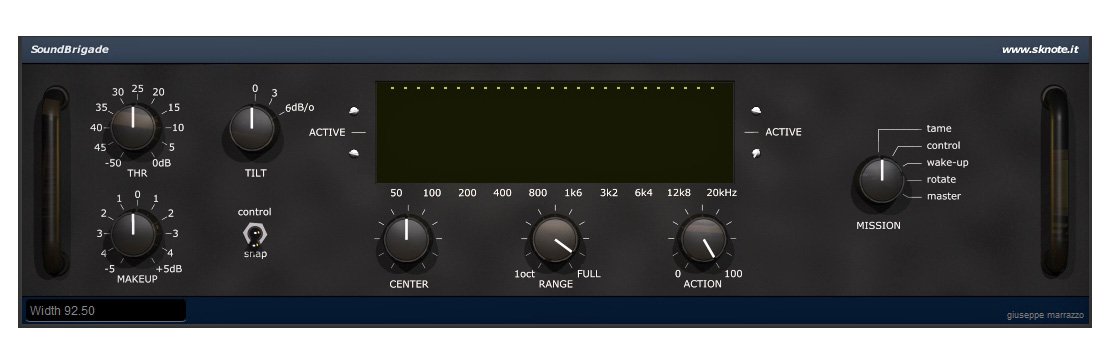 Con SoundBrigate possiamo attenuare dinamicamente una, più risonanze, o un determinato range di frequenze; tenere sotto controllo le note del basso, ammorbidire le alte frequenze (magari senza trascurare il controllo TILT) utilizzandolo come de esser, espandere un determinato range dello spettro, cimentarci in operazioni di sound design, comprimere/espandere in modalità full range, e volendo, conferire carattere/aggressività (utilizzando l’algoritmo CONTROL). Il tutto può essere visto sia in ottica di mix che mastering.