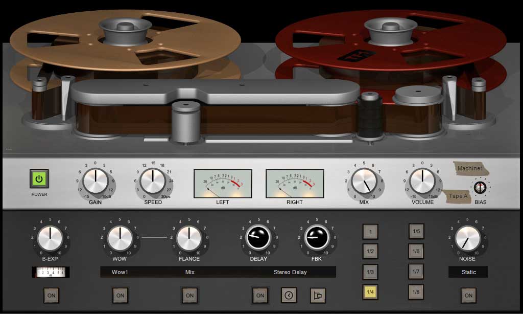 Possiamo portare il nastro a una velocità molto bassa (anche “zero”) con tutte le conseguenze che si hanno sulle alte frequenze, più la possibilità di poter scegliere fra varie tape formula (Tape A–B–C–D) oltre al classico controllo BIAS, che tipicamente possiamo trovare in vari tape emulation in commercio.