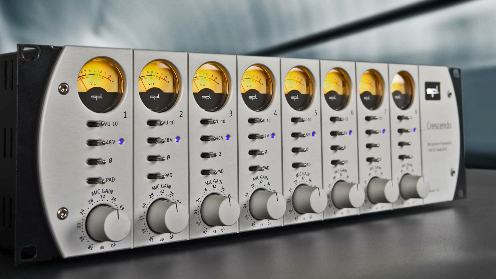 Innanzitutto, il potenziometro del guadagno, sul Crescendo Duo è a step, così da poter matchare perfettamente i due canali in una registrazione stereo, mentre sulla versione ad 8 canali la corsa del potenziometro è continua.