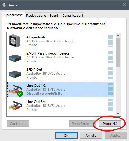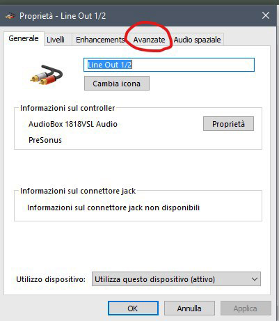 Selezioniamo la scheda audio dedicata che utilizziamo nella DAW e andiamo su Proprietà (Fig.3) e di seguito nella tab in alto Avanzate (Fig.4).