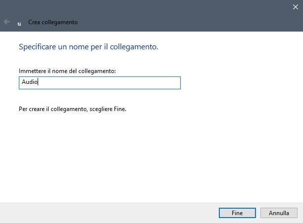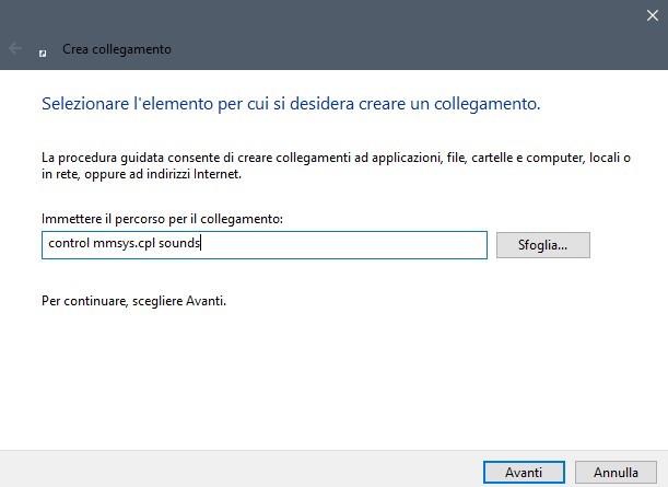 Nella sezione “Immettere il percorso per il collegamento” inseriamo control mmsys.cpl sounds (Fig.7) e clicchiamo su Avanti. Nella finestra successiva ci chiede di specificare un nome per il collegamento che possiamo chiamare Audio (Fig.8).
